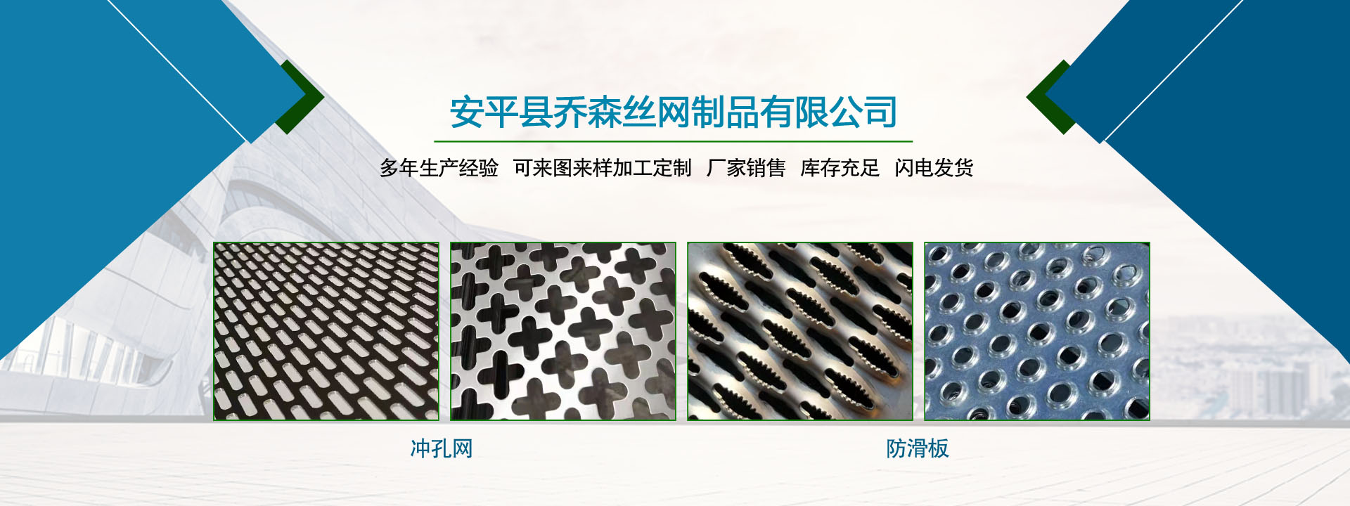 喬森絲網(wǎng)成立于2014年9月,位于中國(guó)絲網(wǎng)之鄉(xiāng)-河北省安平縣,是一家專(zhuān)注于生產(chǎn)金屬絲編織網(wǎng)、金屬網(wǎng)板沖孔及相關(guān)金屬裝飾絲網(wǎng)深加工產(chǎn)品的企業(yè)。從一個(gè)家庭式的小工坊到公司多年來(lái),一直本著以“質(zhì)量求生存,信譽(yù)謀發(fā)展”的生產(chǎn)原則兢兢業(yè)業(yè)穩(wěn)步向前,贏(yíng)得了 一大批忠實(shí)客戶(hù)的廣泛贊譽(yù)。然騏驥一躍,不能十步,駑馬十駕,功在不舍。我們將以更周到的服務(wù),更過(guò)硬的質(zhì)量,不忘初心,為廣大的客戶(hù)提供更優(yōu)質(zhì)的服務(wù)。